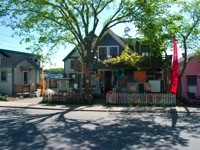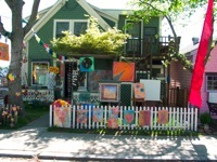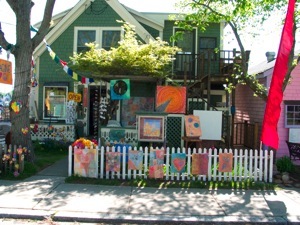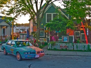 This is Imagine with my funky car stealing the show. My yard is adorned with flowers, flags and my colorful artwork.