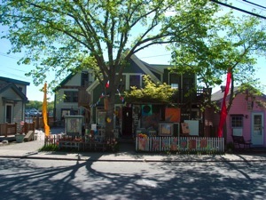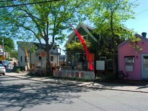 With the cute pink ‘Ice Cream Gallery’ next door. You can just glimpse the harbor behind the yellow flag on left.
